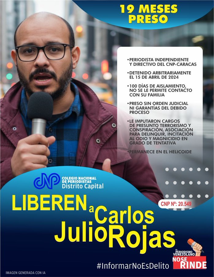 #10Nov | Se cumplen 100 días del aislamiento del periodista Carlos Julio Rojas. Se le niega sistemáticamente el contacto con su familia y abogados. Esto es una violación flagrante a sus #DDHH. Exigimos PRUEBAS DE VIDA y el cese inmediato de esta crueldad. #LiberenACarlosJulio