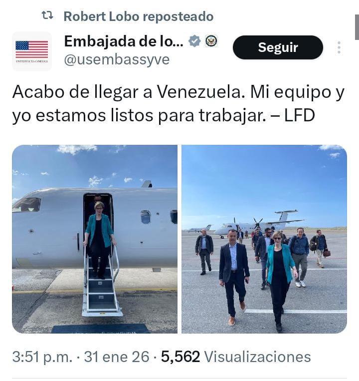 Hemos recibido en Caracas a la diplomática estadounidense Laura Dogu, enviada de EEUU, en el marco de la agenda de trabajo entre el gobierno de la República Bolivariana de Venezuela y de los Estados Unidos de Norteamérica, orientada a marcar una hoja de ruta de trabajo en asuntos… pic.twitter.com/zBJ4kWsUla— Yvan Gil (@yvangil) January 31, 2026