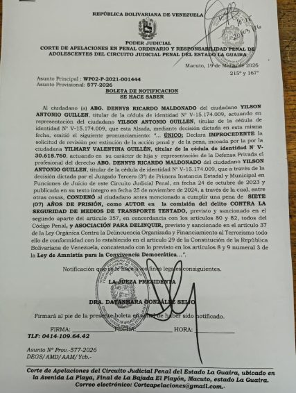 Yilson Guillén cumple una condena de siete años de prisión, de los cuales ha cumplido cuatro años. Permanece recluido en el Comando Nacional Antidrogas (CNA) de Las Acacias, en Caracas.