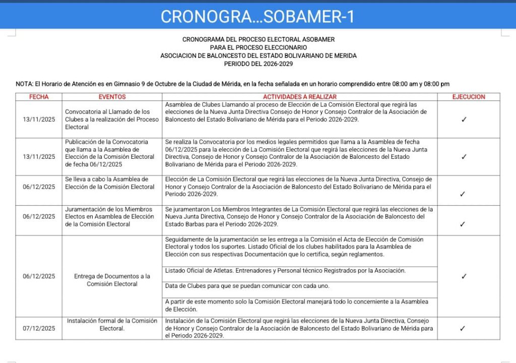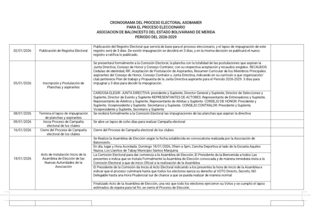 La Comisión Electoral de la Asociación de Baloncesto del Estado Mérida, informa que el proceso electoral para elegir la junta directiva se efectuará en el mes de enero de 2026.