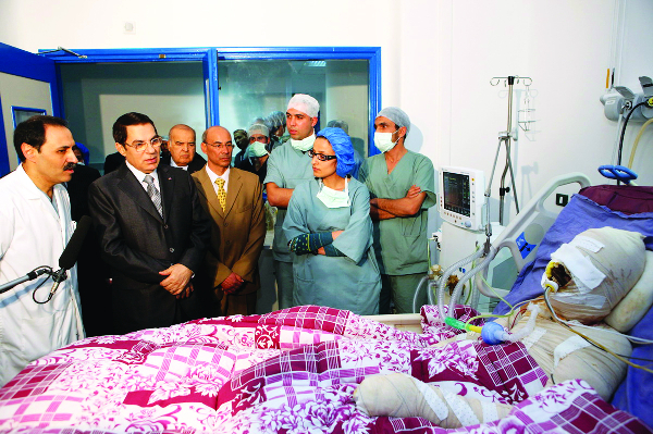 Inmediatamente Tariq fue transferido a un hospital en la provincia de Sfax; y, finalmente, a un hospital de Ben Arous (cerca de Túnez, la capital del país). En ese hospital fue visitado por el aún presidente Ben Ali, quien se dejó retratar junto a Tariq («Un cuerpo inerte, una momia completamente vendada»), y quien prometió que lo enviaría a Francia a recibir tratamiento, aunque al final no cumplió esa promesa.